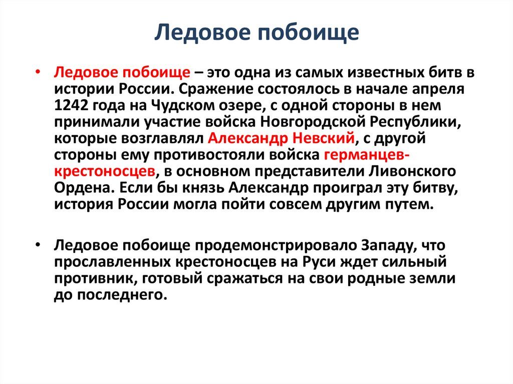 Ледовое побоище, или сражение на Чудском озере, вошло в историю России как пример ожесточенного сопротивления западным завоевателям и стратегического таланта Александра Невского. Победа русских войск во главе с Александром Ярославичем имела большое значение для развития русских земель. По сей день мы помним об этом сражении и почитаем подвиг русских воинов. События Ледового побоища находит отражение в культуре и искусстве, а князь Александр Ярославич Невский почитается как общерусский святой.Разберем причины Ледового побоища и узнаем, как русское войско смогло одержать победу и какое значение имели итоги битвы на Чудском озере для земель северо-запада Руси.